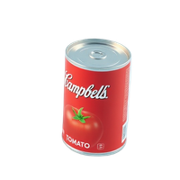 A standard can of condensed tomato soup, such as Campbell's iconic product, commonly purchased as a grocery staple.