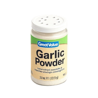 A 3.4 oz container of Great Value brand garlic powder with a convenient screw top and perforated lid for seasoning.