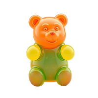 Gummy bears are chewy fruit-flavored gelatin candies typically sold in small bags at grocery stores.