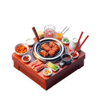 A meal at a Korean BBQ restaurant where diners grill meat at their table, typically including banchan (side dishes) and multiple meat options.