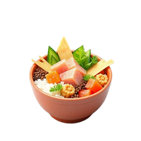 A poke bowl is a fast-casual restaurant dish featuring cubed raw fish like tuna or salmon mixed with rice, vegetables, and sauces.