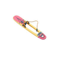 Water skis are a pair of recreational sports equipment used for gliding over water while being towed by a boat, typically including bindings for secure foot attachment.