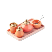 A condiment set for tableware dining is a matching collection of small dishes, jars, or holders typically including salt, pepper, mustard pot, and spoons for serving at the dinner table.