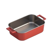 A roasting pan is a large, shallow rectangular or oval metal cookware vessel with raised sides, typically used for roasting meats, poultry, and vegetables in the oven.