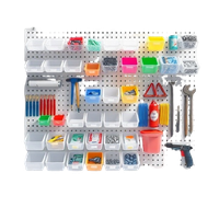 Pegboard bins are clear plastic storage containers that hang on pegboards to organize small items like tools, hardware, nuts, bolts, and craft supplies in garages or workshops.
