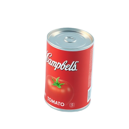 A standard can of condensed tomato soup, such as Campbell's iconic product, commonly purchased as a grocery staple.