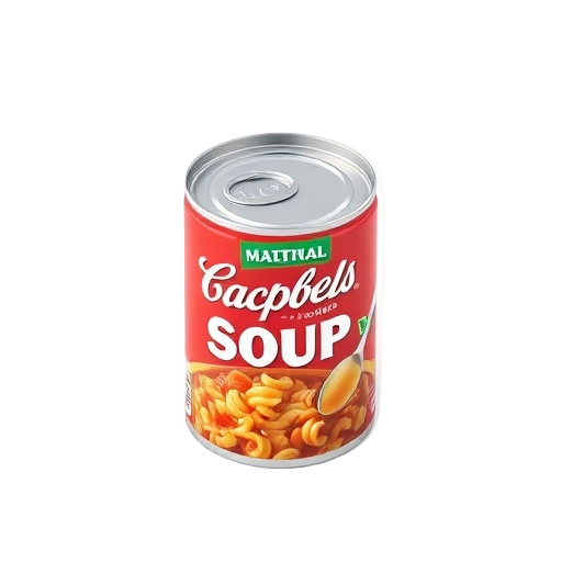 Canned soup refers to ready-to-eat or condensed soup in a metal can, commonly chicken noodle or tomato varieties used as provisions for quick meals.