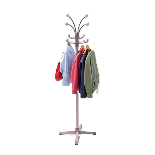 A coat rack is a freestanding or wall-mounted furniture piece designed to hang coats, hats, bags, and umbrellas in entryways.