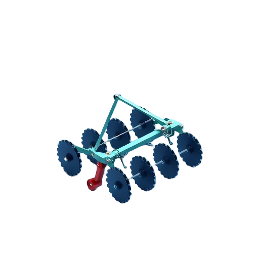 A disc harrow is a heavy farm implement with concave discs mounted on a frame, used to till and break up soil for planting.