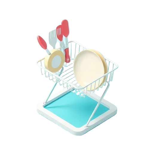 A dish rack is a kitchenware item used for air-drying washed dishes, utensils, and cookware near the sink.