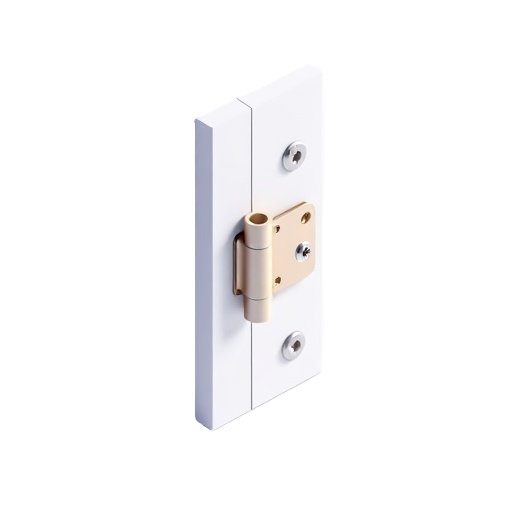 A door hinge is a standard metal pivot device used to attach a door to its frame, allowing it to swing open and closed in household settings.
