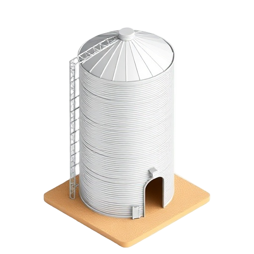 A grain silo is a heavy equipment storage structure typically made of steel for holding large quantities of grain on farms or commercial operations.