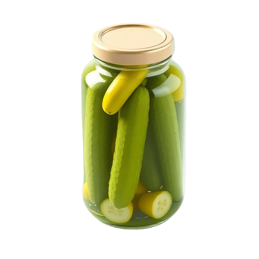 A jar of pickles is a standard glass container of preserved cucumbers, typically dill-flavored, sold as a common grocery item in sizes around 24-46 fl oz.