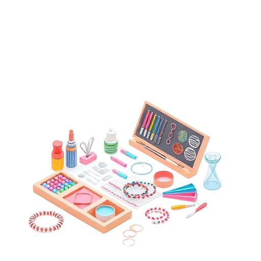 A jewelry making kit is a craft hobby set containing beads, strings, findings, and tools for creating bracelets, necklaces, or earrings, often targeted at kids or beginners.