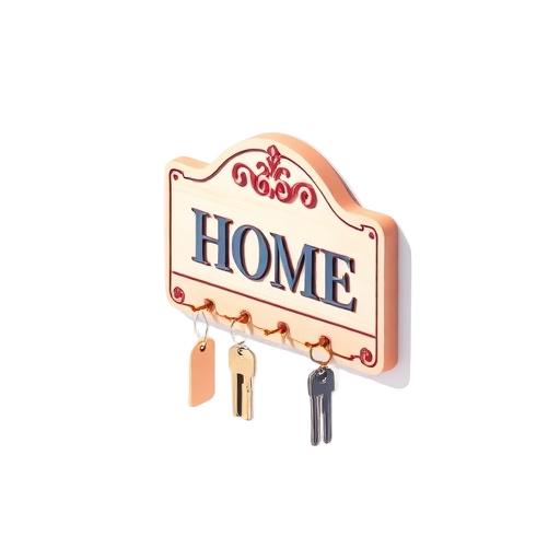A key holder in home decor context is a decorative wall-mounted rack or plaque with hooks designed to organize keys near entryways, often featuring signs like 'Home' or personalized designs.
