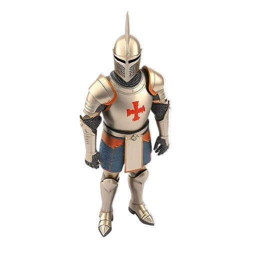 A medieval suit of armor is a full-body protective ensemble of steel plates worn by knights, typically featuring a helmet, breastplate, arms, legs, and gauntlets.