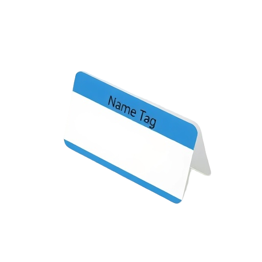A name tag in office supplies context is a peel-and-stick adhesive label badge used for temporary identification at meetings, events, or offices.