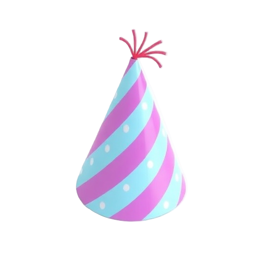 A conical paper hat with a festive elastic chin strap, commonly worn at birthday parties, New Year's, or other holiday celebrations.