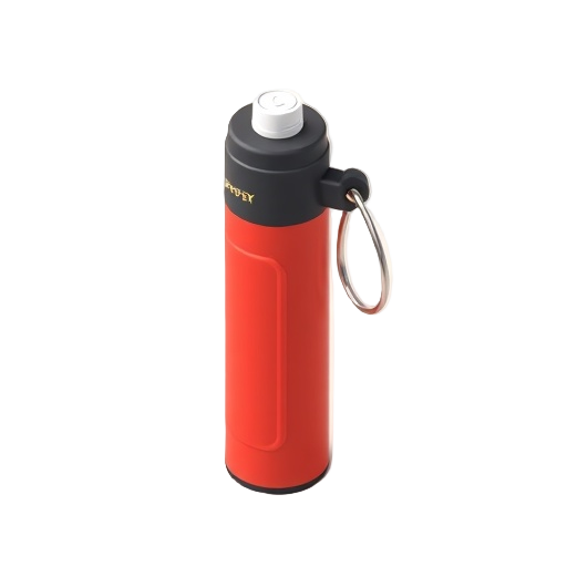 A self-defense aerosol spray canister containing capsaicin-based irritant, typically pocket-sized and available with keychain attachments.