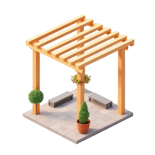 A pergola is an open outdoor structure with a slatted roof used in landscaping to provide shade and define garden spaces.
