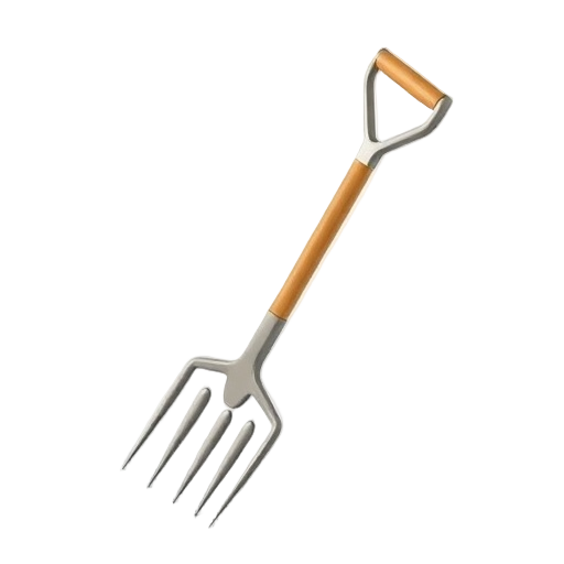 A pitchfork is a long-handled garden tool with sharp, widely spaced tines designed for lifting, turning, and moving loose materials like hay, mulch, compost, or manure.