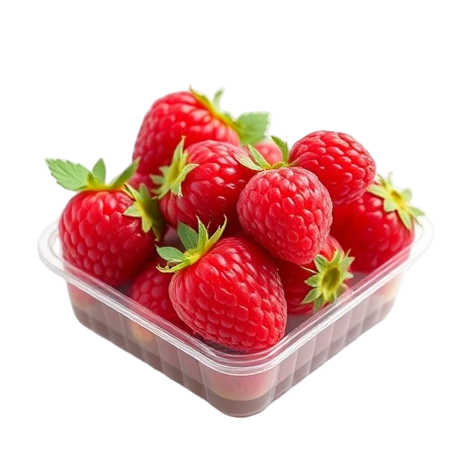 Fresh raspberries are small, red, edible berries commonly sold in grocery stores in plastic clamshell containers.