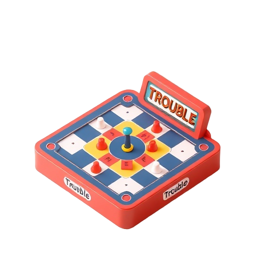 Trouble is a classic Hasbro board game where players race to move pegs around the board using a Pop-O-Matic die roller.