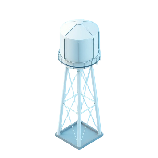 A water tower is a large elevated structure used to store and distribute water supply for municipalities or industrial sites, typically holding hundreds of thousands to millions of gallons.
