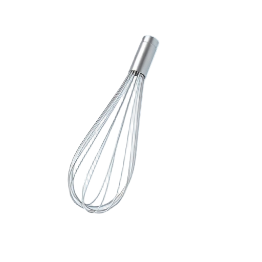 A stainless steel kitchen whisk used for beating, whisking, and stirring ingredients in cooking and baking.