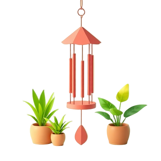 A wind chime is a decorative garden hanging ornament that produces soothing sounds when moved by the wind, commonly used to enhance outdoor ambiance among plants.