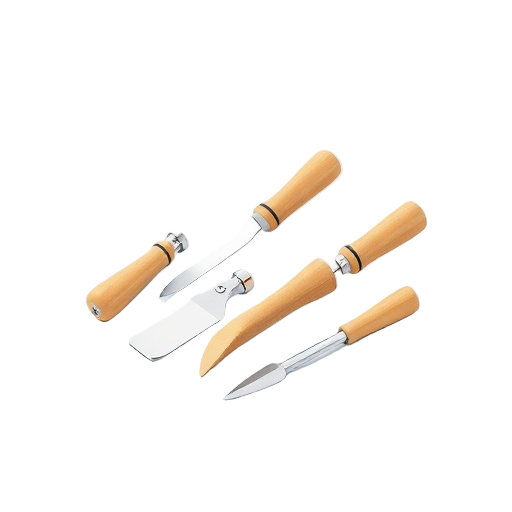 A wood carving set is a collection of handheld tools with tempered steel blades and wooden handles designed for beginners to carve wood in art and craft projects.